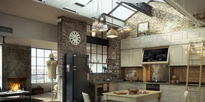 Отличительная особенность дизайна лофт интерьера - отсутствие перегородок и высокие потолки. Зонирование квартиры производится благодаря мебели. В качестве отделочных материалов используются бетон, грубая штукатурка и керамический пол.