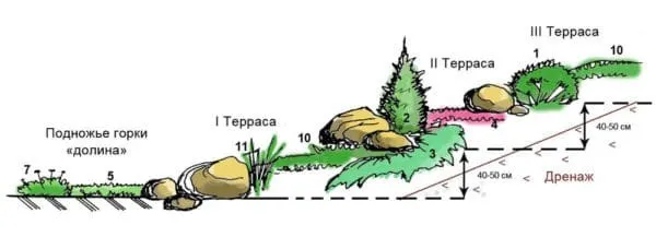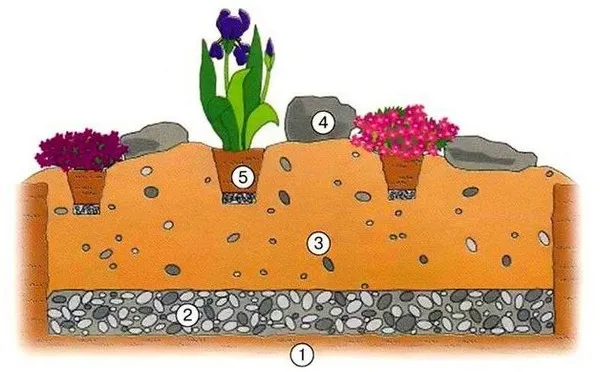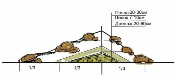 Установка альпийской горки начинается ранней осенью. Сначала делается разметка участка. Если альпинарий будет занимать большую площадь, то нужно не забыть сделать тропинки и переходы, чтобы была возможность подобраться ко всем растениям. Для подготовки площадки снимается верхний слой земли глубиной примерно 30 сантиметров, очищается от посторонних предметов и травы, укладывается дренажный слой толщиной 10 сантиметров и тщательно проливается водой. Затем насыпается крупный песок на высоту 5-10 сантиметров и опять заливается водой. Почва подготавливается из вырытой ранее земли, перемешанной в равных количествах с песком, торфом и удобрениями. Вся эта смесь засыпается на дренажный слой. Если горка будет многослойная, то таким же образом формируется оставшийся каскад и оставляется на усадку. Следующий этап работ можно начинать не ранее, чем через 3 недели.