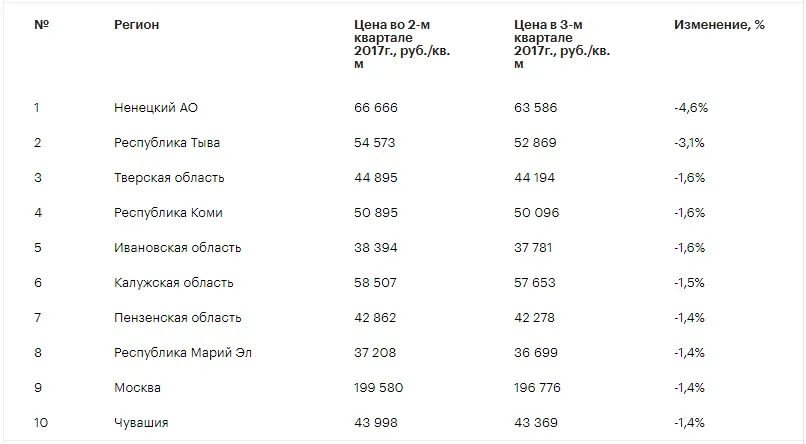 В первую пятерку вошли также Тверская и Ивановская области и Республика Коми — в каждой из них квадратный метр подешевел на 1,6%. Москва в этом рейтинге стоит на девятом месте — здесь цена квадратного метра уменьшилась на 1,4%. В целом в России средняя стоимость «квадрата» снизилась на 0,6% за минувший квартал.
