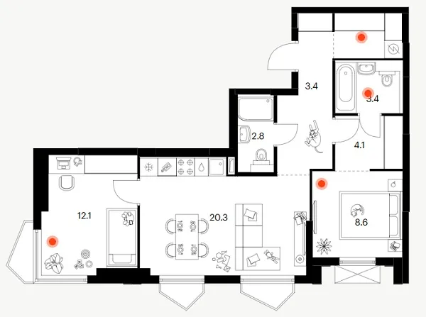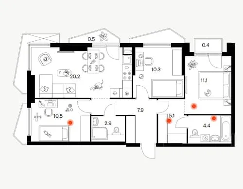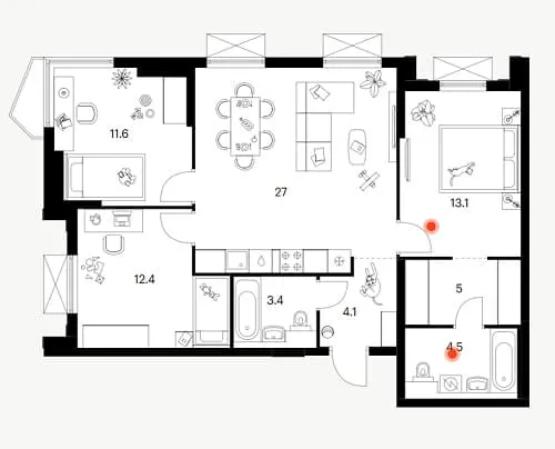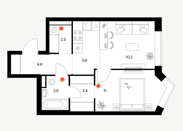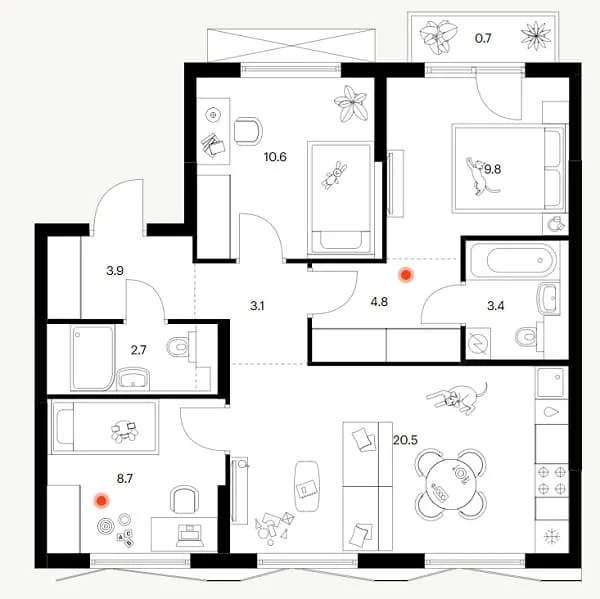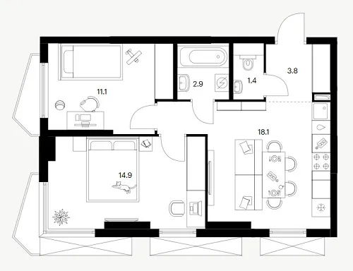 Фасады корпусов отличаются разнообразием форм балконов: здесь представлены как классические прямоугольные, так и фигурные решения. Все они ориентированы в тихий, озелененный внутренний двор. Дополнительную выразительность планировкам придают просторные лоджии, расположенные в эркерных частях зданий.