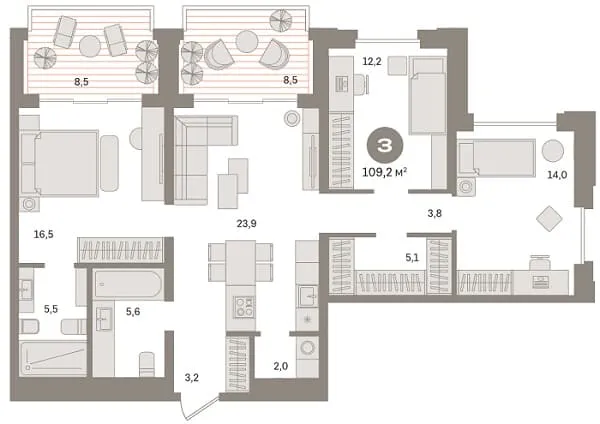 Архитектурный облик нового квартала выдержан в ключе современных тенденций минимализма, акцентируя внимание на чистоте линий и функциональной эстетике. Применение динамичных элементов и минималистичных фасадов в сочетании с продуманным остеклением создает эффект простора и открытости. Вершины зданий украшены террасами, предлагая жителям живописные виды на городской пейзаж. Строгая, но выразительная визуальная композиция подчеркивает статус комплекса как объекта бизнес-класса.