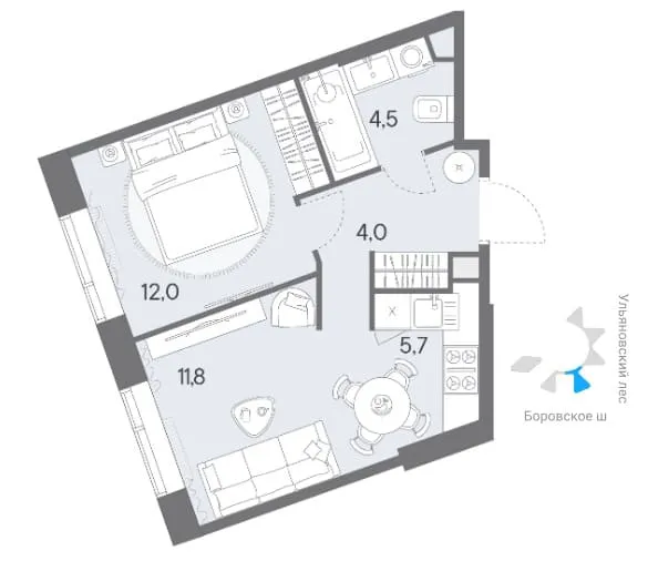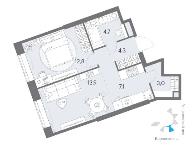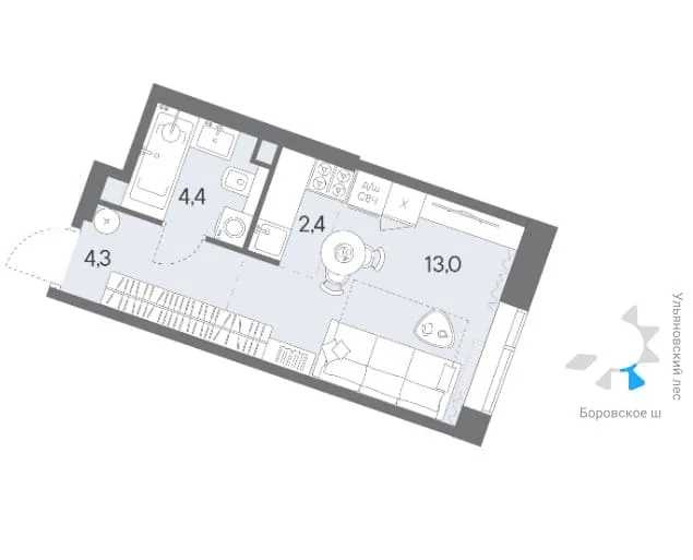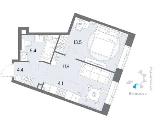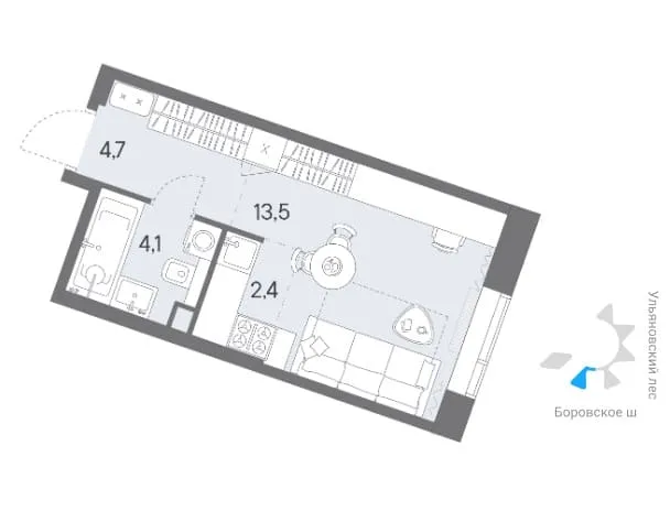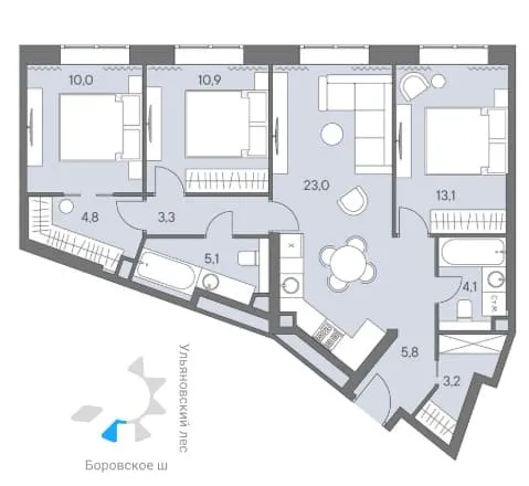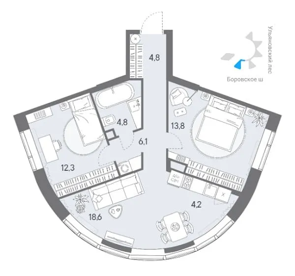 В комплексе представлено более 40 планировочных решений — от компактных студий до просторных пятикомнатных квартир.