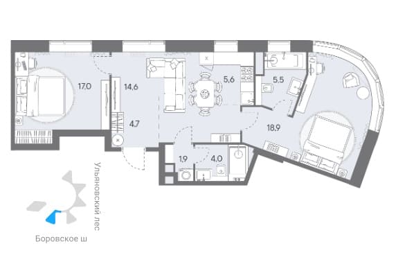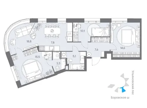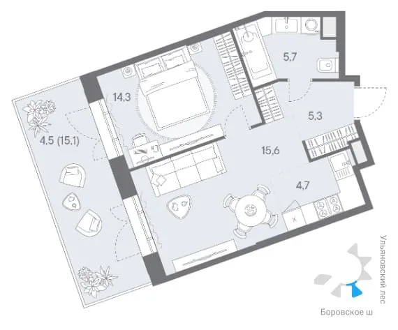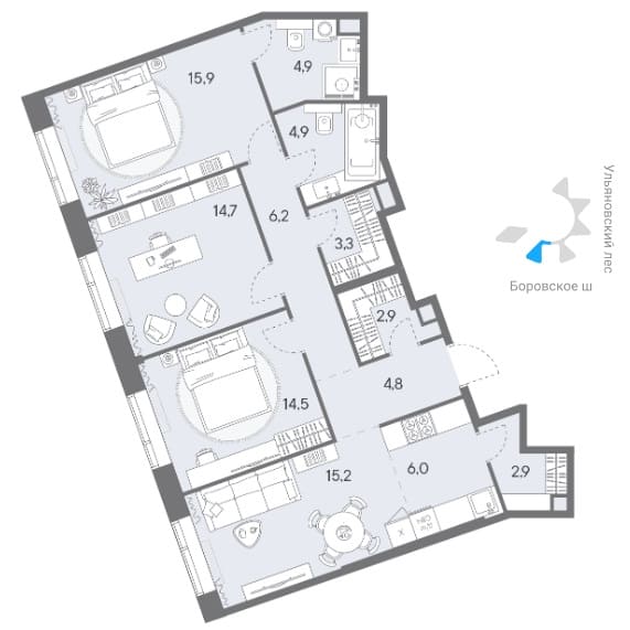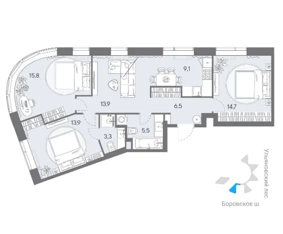 Особенности: Многие квартиры имеют евроформат (кухня-гостиная), панорамные окна с видами на лесопарк, трехсторонний обзор. В семейных планировках предусмотрены гардеробные, постирочные и кладовые помещения. Доступны эксклюзивные варианты с видовыми террасами.